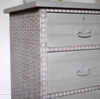 The top and drawers of this chest have been painted with Annie Sloan Chalk Paint in Paris Grey. The sides have been stencilled using the Kasbah Stencil and finished with a whitewash top coat. The lovely ornate metal drawer pullers have been painted and lightly distressed.